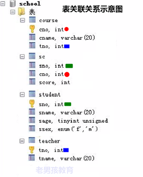 use school student :学生表 sno: 学号 sname:学生姓名 sage: 学生年龄 ssex: 学生性别 teacher :教师表 tno: 教师编号 tname: 教师名字 course :课程表 cno: 课程编号 cname:课程名字 tno: 教师编号 score :成绩表 sno: 学号 cno: 课程编号 score:成绩(2)各个表关联关系