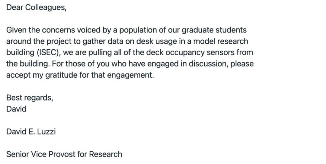 之后,Von Hippel在推特上记录了从秘密安装传感器到听证会的整个事件时间线。几个小时后,传感器被移除,Luzzi写了最后一封邮件,“鉴于一些研究生对在ISEC内收集办公桌使用数据的项目表示担忧,我们将从大楼内撤走所有传感器”。