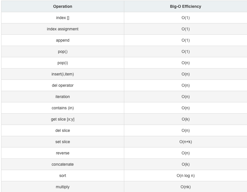 列表的相关操作的方法都是被封装好的,我们没有必要对相关操作的底层算法时间进行分析,下面直接给出大家一张基于列表操作的时间复杂度的表,供大家参考: