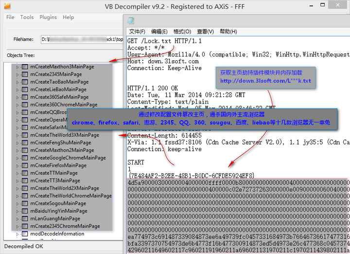 通过对浏览器的配置文件格式和加密算法做逆向分析,实现主页篡改。Chrome、QQ、360等20余款主流浏览器无一幸免。
