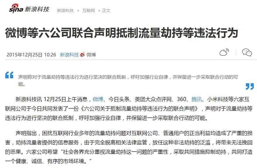 在15年底,深受运营商劫持困扰的腾讯、源码库小米、微博等6家互联网公司,共同发表了一篇抵制运营商流量劫持的联合声明。