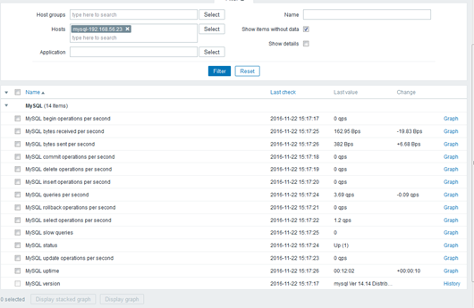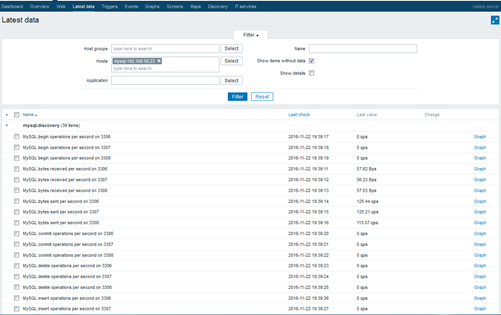 UserParameter=mysql.discovery,sh /etc/zabbix/scripts/discover.shUserParameter=mysql-status[*],echo "show global status where Variable_name=$2;" |mysql -S /data/$1/mysql.sock -N | awk {print $$2}UserParameter=mysql-ping[*],mysqladmin -S /data/$1/mysql.sock ping | grep -c aliveUserParameter=mysql-version,mysql -V[root@agent zabbix_agentd.d]# service zabbix-agent restartShutting down Zabbix agent: [ OK ]Starting Zabbix agent: [ OK ]在zabbix-server上分别进行如下测试