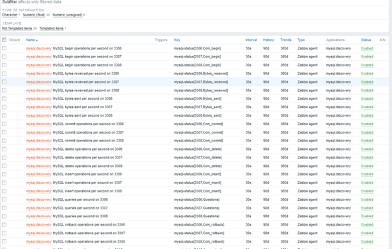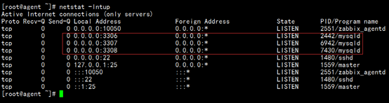 [root@agent ~]# sh /etc/zabbix/scripts/discover.sh{"data":[{"{#MYSQLPORT}":"3306"},{"{#MYSQLPORT}":"3307"},{"{#MYSQLPORT}":"3308"}]}sed -i 98a zabbix\tALL=(ALL)\tNOPASSWD: /bin/netstat /etc/sudoerssed -i s@^Defaults requiretty@#Defaults requiretty@g /etc/sudoers[root@agent ~]# cd /etc/zabbix/zabbix_agentd.d/[root@agent zabbix_agentd.d]# vi mysql.conf内容如下: