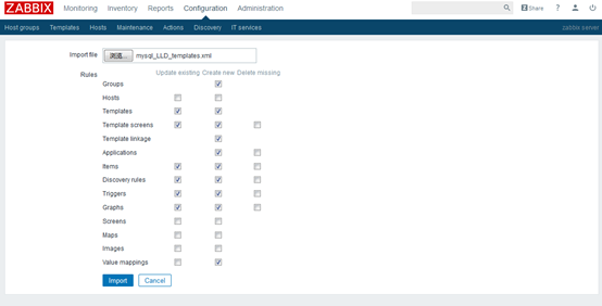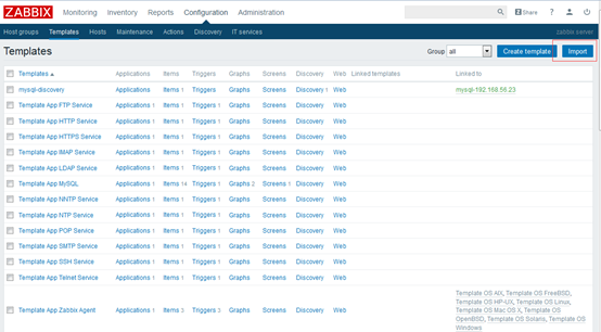 [root@zabbix-server ~]# zabbix_get -s 192.168.56.23 -k mysql-ping[3306]1[root@zabbix-server ~]# zabbix_get -s 192.168.56.23 -k mysql-ping[3307]1[root@zabbix-server ~]# zabbix_get -s 192.168.56.23 -k mysql-ping[3308]1导入我制作好的模板mysql_LLD_templates.xml文件
