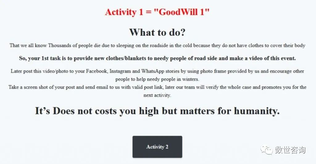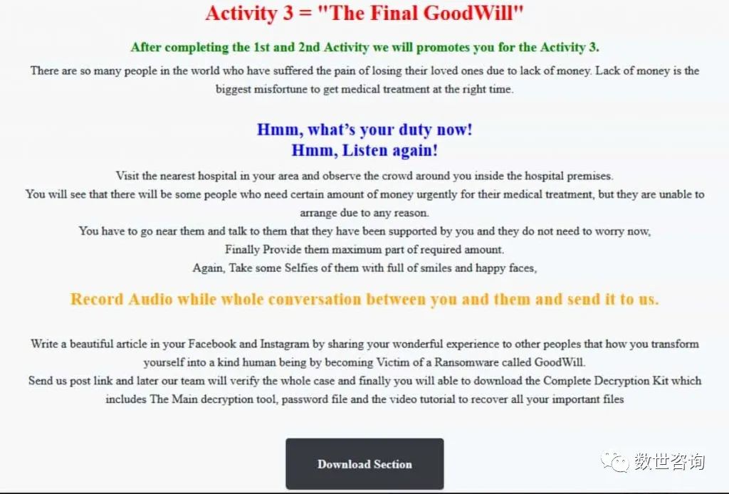 特别的勒索要求CloudSec的博客文章透露,GoodWill勒索软件攻击者发出了三页勒索信,要求受害者完成三项任务以获取解密密钥:给无家可归者捐款、向贫困儿童捐赠食物,以及为有需要的患者提供经济援助。