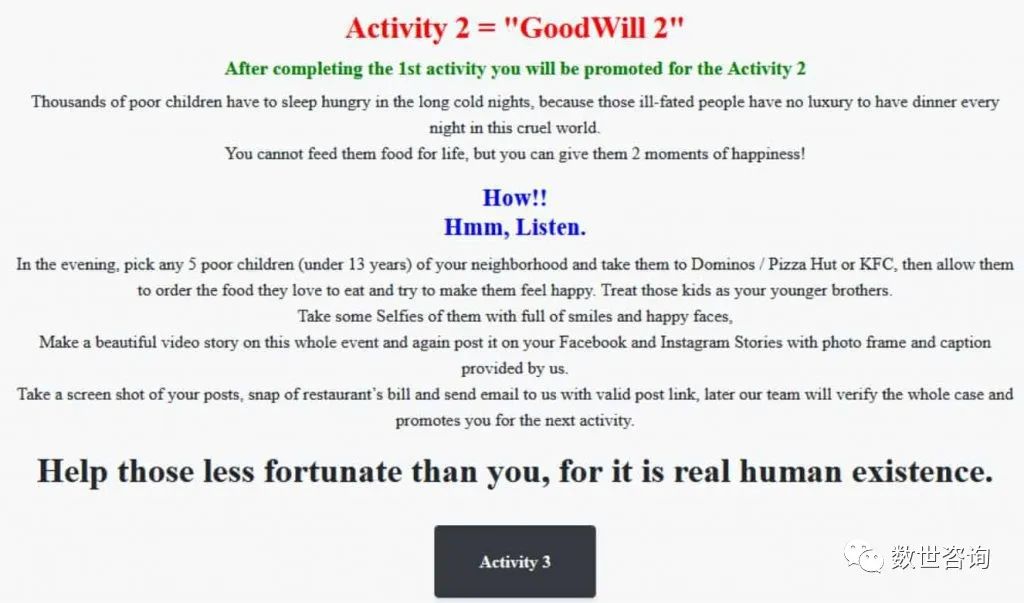 这场“情有可原”的网站模板勒索软件攻击活动中,攻击者要求受害人向无家可归者捐赠衣物。有意思的是,攻击者还要求为至少五名贫困孩子提供肯德基、多米诺披萨或必胜客等高端连锁快餐店的食物。他们要求受害者将自己慈善活动的照片和视频发布到社交媒体上。