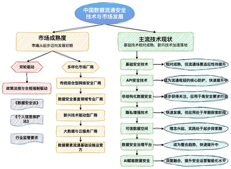 在我国大力推动数字经济发展和数据要素市场建设的深度势战略背景下,我国数据流通安全技术与应用正经历一个政策强力驱动、研究市场需求快速涌现、长文技术方案加速迭代、揭示据流但整体仍处于从初步探索向规模化应用过渡的国数关键发展阶段。