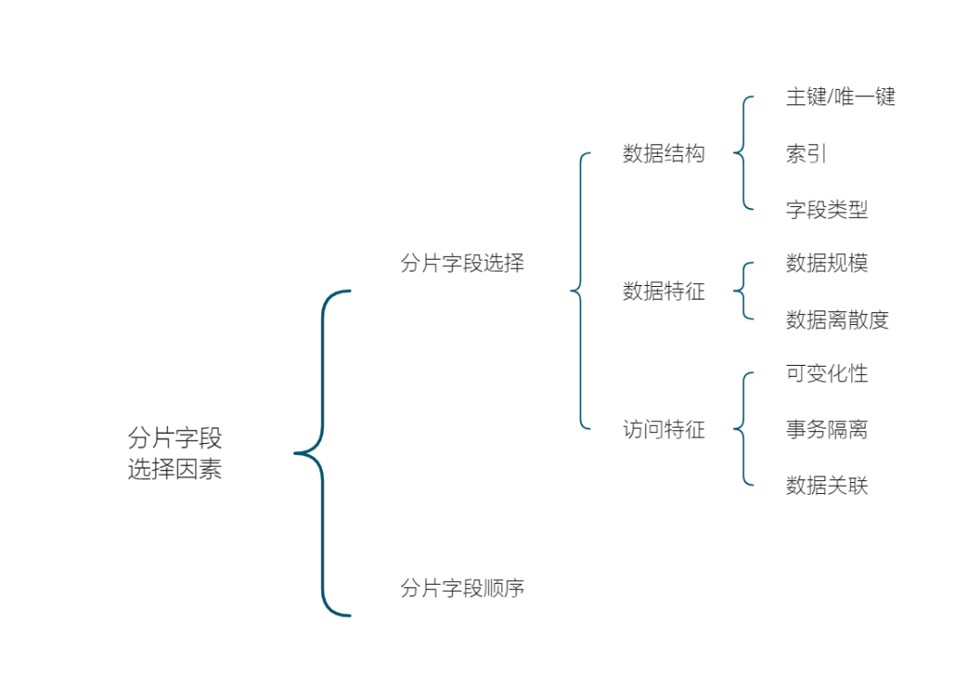 2).分片字段分片字段的选择,需涉及的因素很多,列个脑图分类下。下面将针对各因素详细说明: