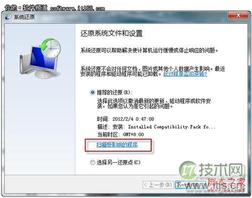 2.选择一个已经创建的还原点,点击下方的“扫描受影响的程序”进入下一步操作。