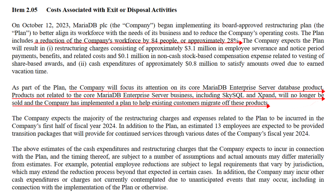 “与MariaDB Enterprise Server核心业务无关的产品,包括SkySQL和Xband,将不再销售,公司已实施计划帮助现有客户迁移这些产品。”