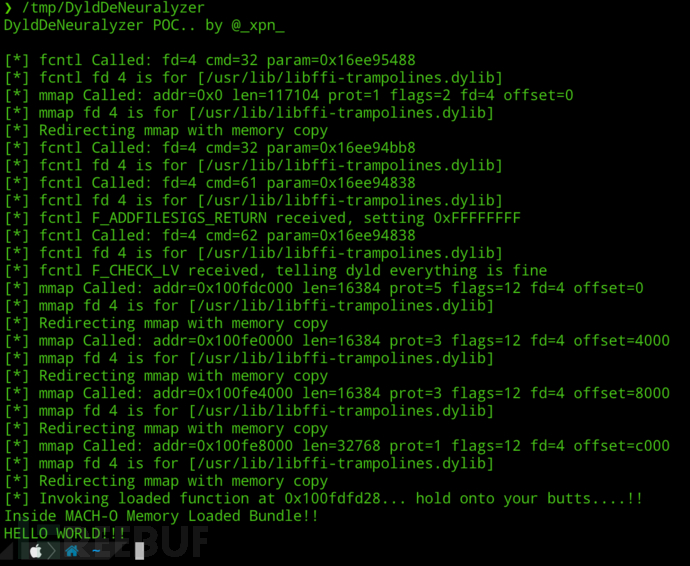 这里有一些注意事项。首先,我们需要确保库比我们自己要加载的模块大,否则当涉及到pread和mmap时,系统最终会截断我们的Mach-O。