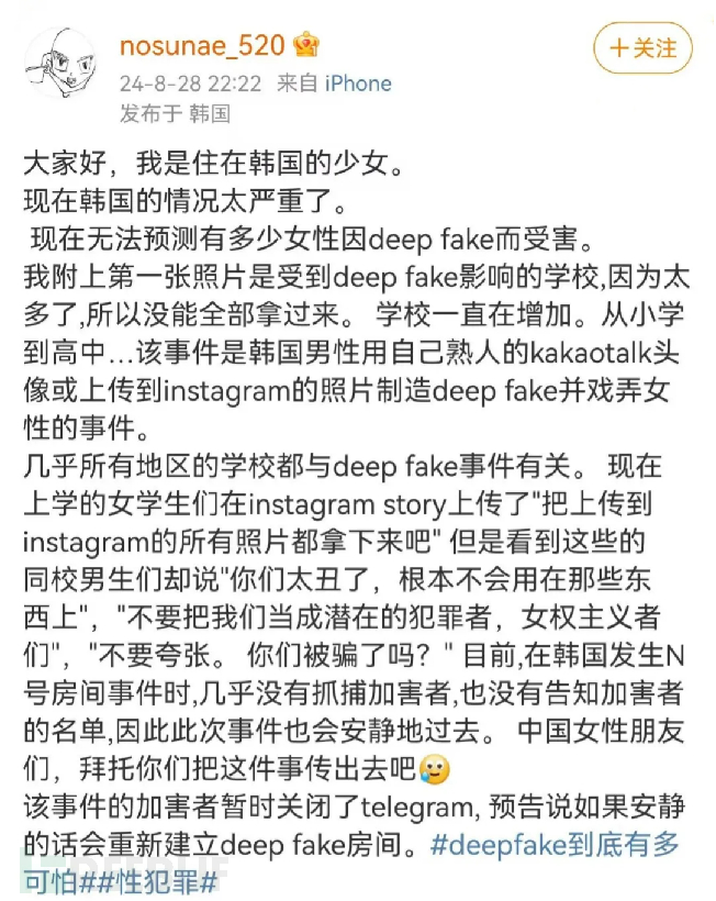 AI换脸技术横行,色情视频泛滥爆发恐慌事情的起因始于8月28日,一位IP定位在韩国的网友在社交平台发布了一则求救信息,其中提到:韩国国内AI换脸技术横行,很多女学生、老师、甚至是未成年人都被AI换脸做成了特殊用途的视频,这些视频在网络上广为传播,给当事人的生活带来了巨大的挑战,她请求中国网友帮她们转发扩散,以引起社会的关注。