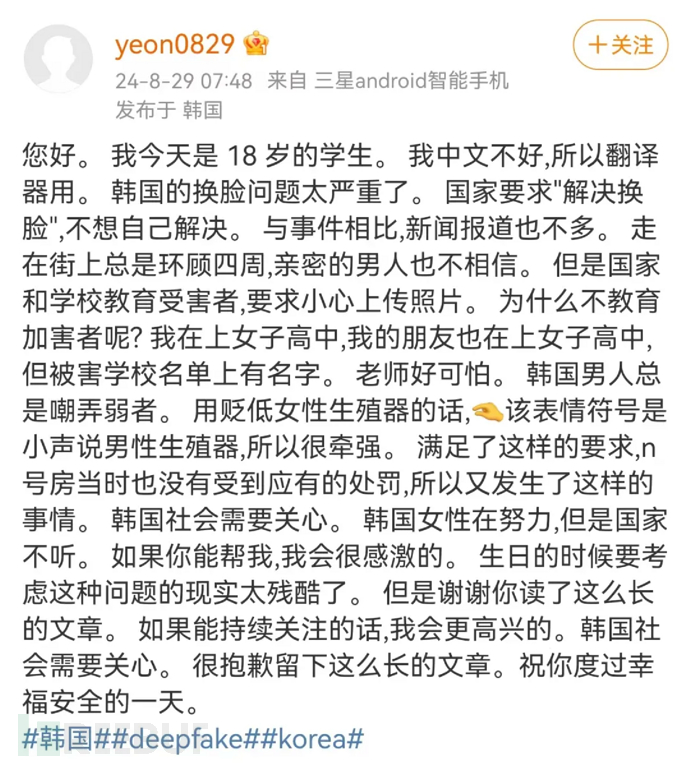 次日,又有一名韩国网友出来发声,她说自己是一名18岁的学生,由于AI换脸现象泛滥,导致她现在走在路上都怕被人偷拍,就连最亲近的人都不敢相信,她希望中国的网友能帮她走出困境。
