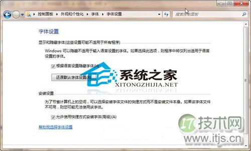 首先,在刚才的界面上点击“字体设置”(如上图),进入字体设置界面,勾选“允许使用快捷方式安装字体(高级)(A)”。