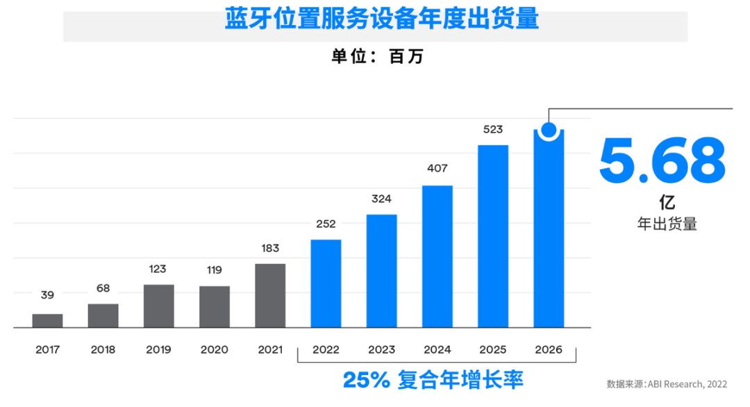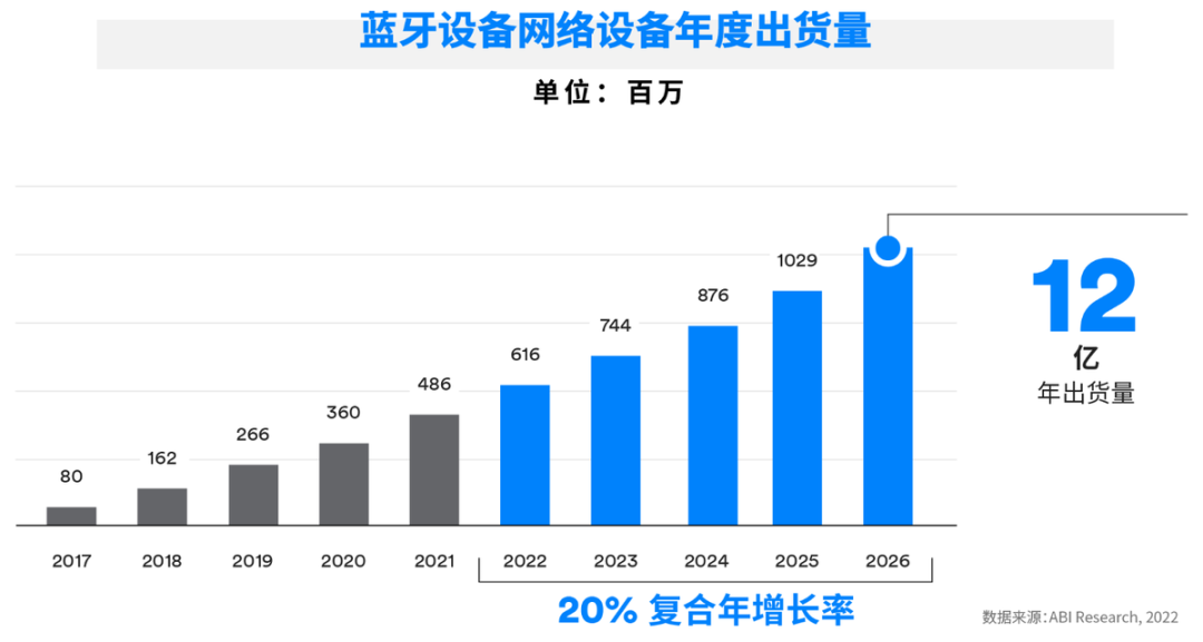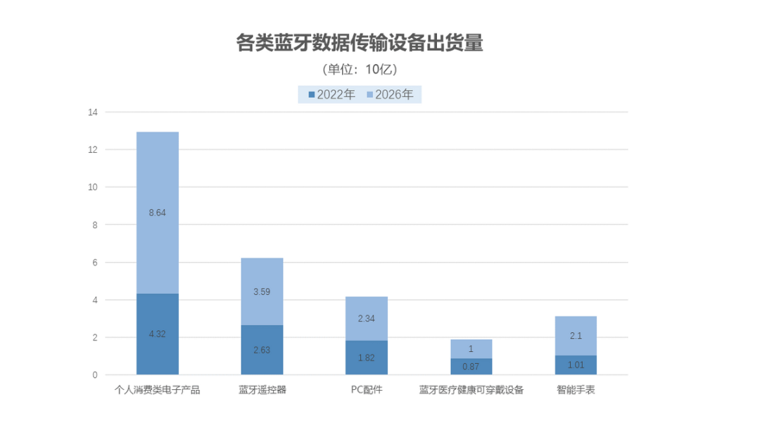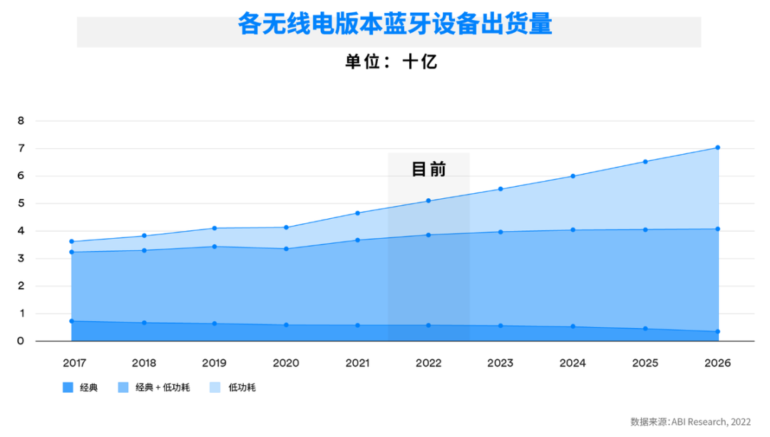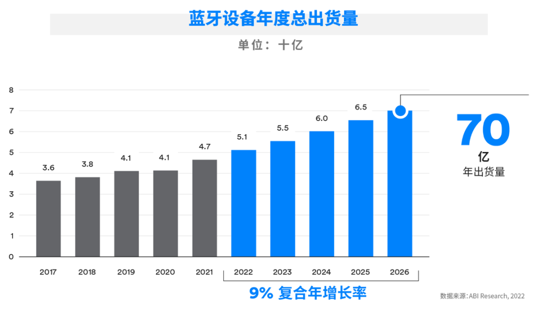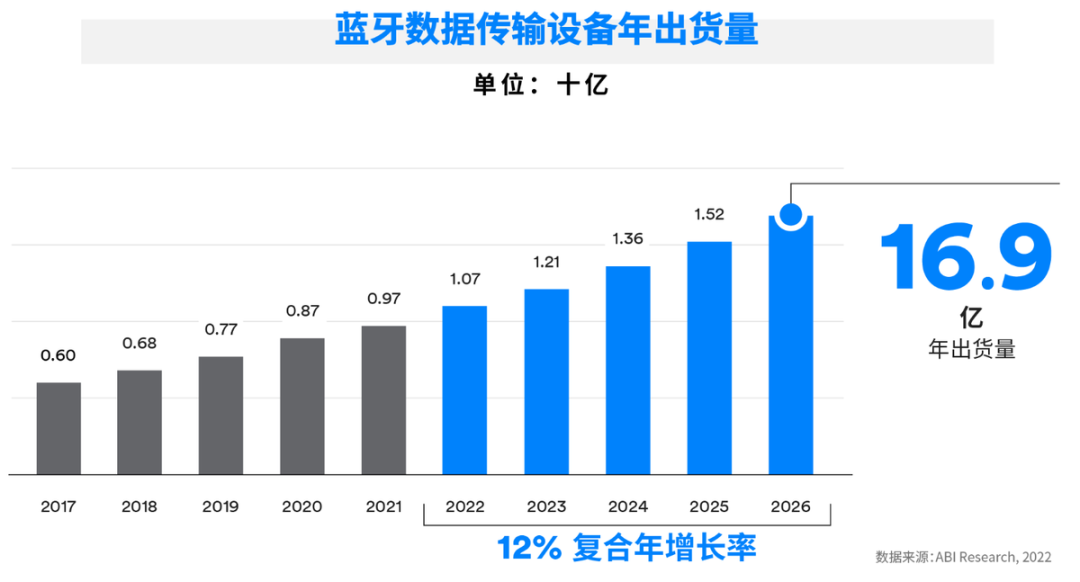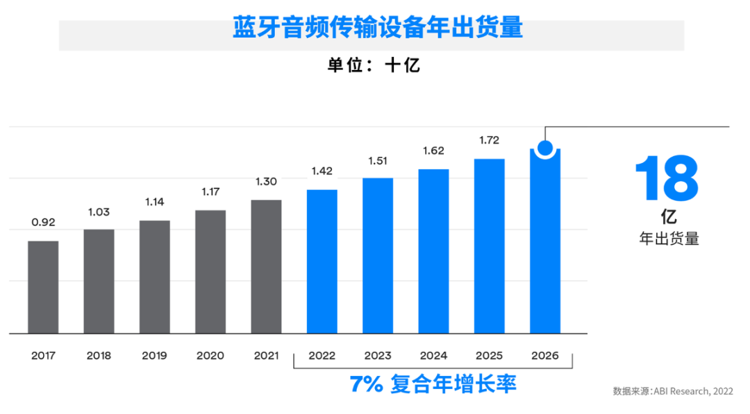 据ABI Research预计,个人蓝牙消费类电子产品的出货量在2022年将达到4.32亿件,到2026年,该出货量将翻番。