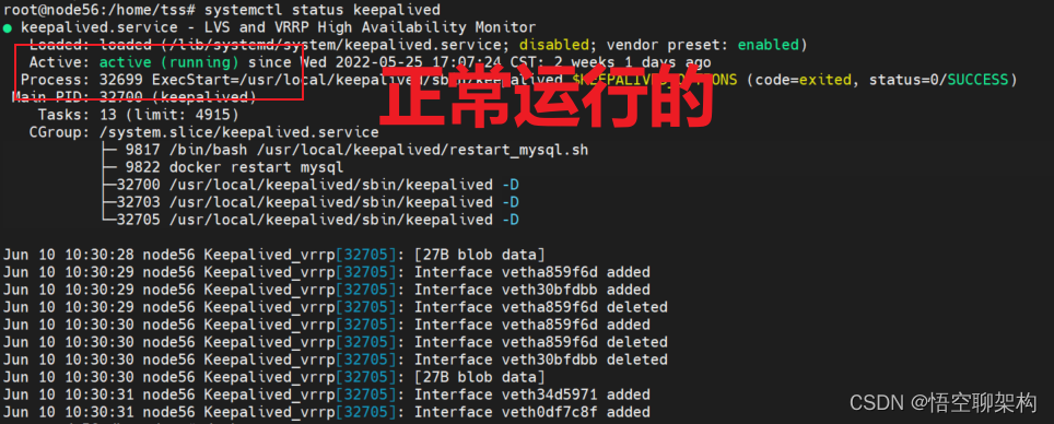 ④ 赶紧检查一波 Keepalived,发现两台 Keepalived 是正常运行的。通过执行命令查看:systemctl status keepalived
