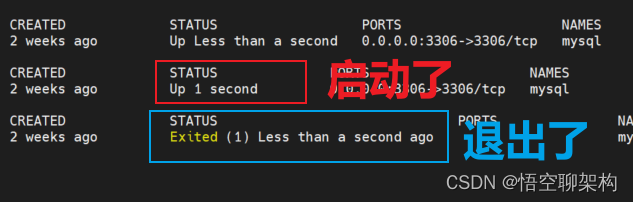 ⑤ 纳尼,Keepalived 也是源码库正常的, Keepalived 每隔几秒会重启 MySQL,可能我在那一小段空闲时间没看到 MySQL 容器启动?换个命令执行下,docker ps -a,列出所有容器的状态。可以看到 MySQL 启动后又退出了,说明 MySQL 确实是在重启。