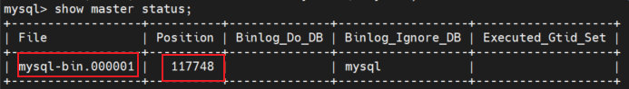 记下这两个信息:File=mysql-bin.00001,Position=117748。(这里也有个坑:先要锁表,再看这两个值,从库开始同步后,再解锁表)。