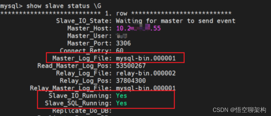 # 开启同步START SLAVE;1.2.3.4.5.6.7.8.9.10.11.12.13.再次查看就不报错了,I/O 线程也跑起来了,
