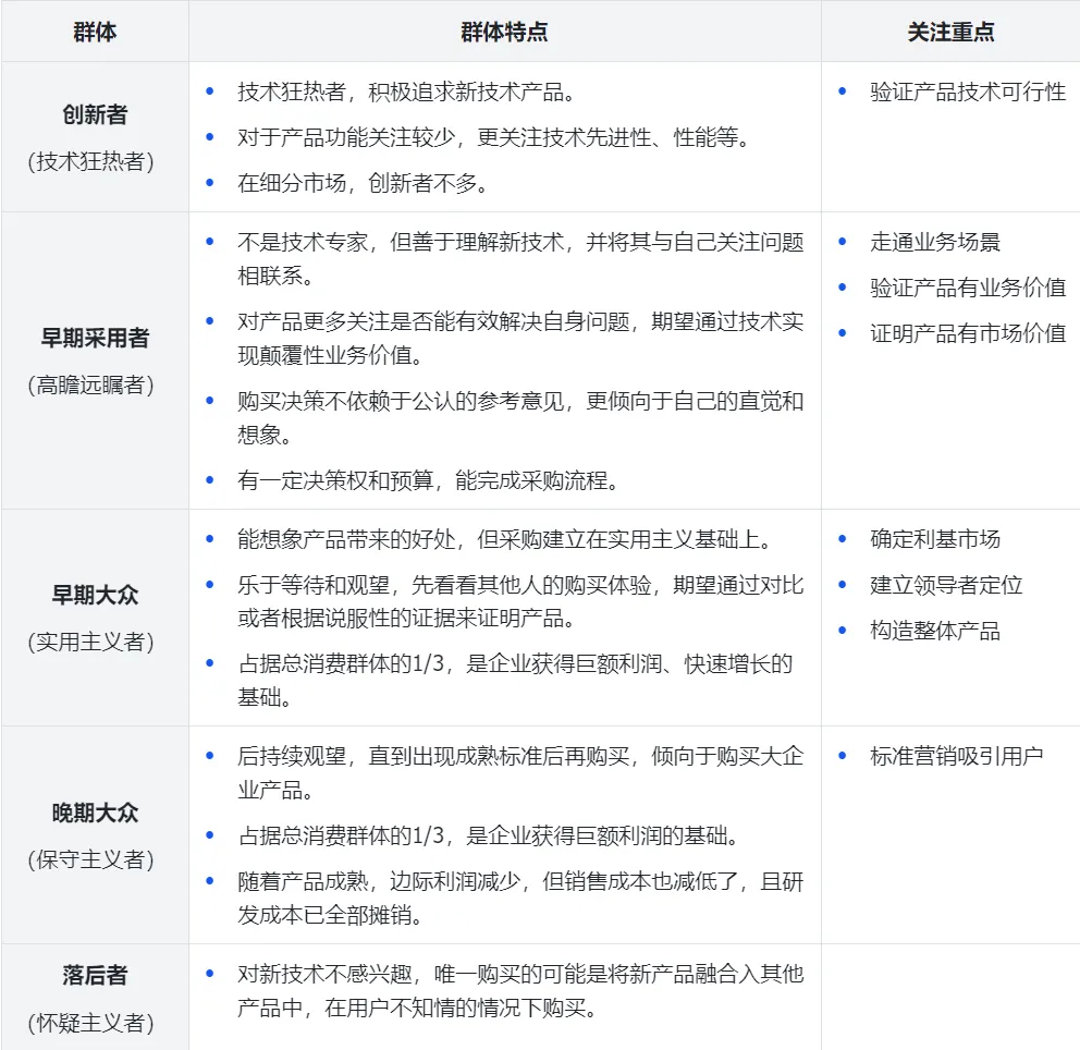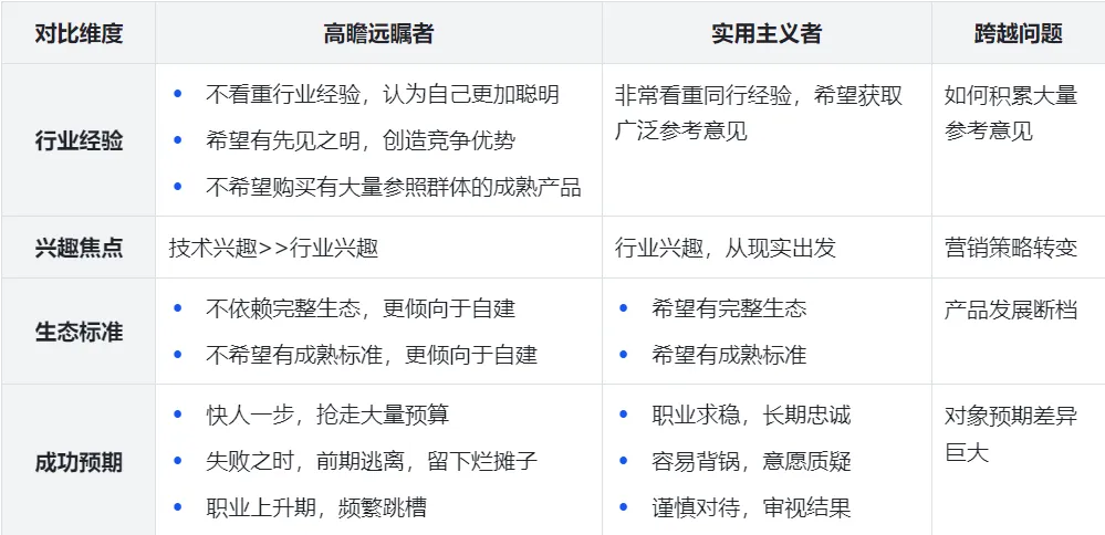 根据企业产品所处的生命周期阶段,做好对应的营销策略,对不同人群(技术狂热者、高瞻远瞩者、实用主义者、保守主义者、怀疑主义者)都应该有不同的策略。举了例子,针对实用主义者,就不要讲技术先进性,而是要讲什么是标准,我们应该怎么做的问题。其实这点对于国内数据库厂商产品表现很明显,有些产品已经明显走过了高瞻远瞩者的阶段,开始面向早期采用者做营销宣传,但对外输出内容上,仍然将重心放在打榜、评测等方面;反之有点厂商产品还在初期节点,就开始找合作伙伴推解决方案,其真正产品价值路径还未跑通。