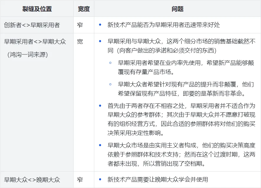 从上表可见,实用主义者再决定购买时,不会基于参考高瞻远瞩者的意见,因此鸿沟天然出现了。如果企业针对高瞻远瞩者的营销取得成功后,没有及时转型,过度宣扬前期取得的傲人成绩,并不能取得好的效果。实用主义者想听到的是符合“行业标准”,而企业却在宣传产品如何“先进”。