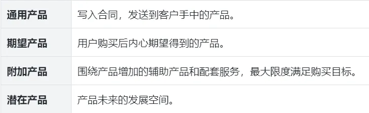在精确市场后,需根据产品特征构建产品,这其中涉及一个重要的概念~“整体产品”。在营销时向客户承诺交付的产品跟实际交付的产品是不一样的,两者之间会存在落差。要消除落差,必须强化产品,增加配套服务和辅助产品,使之成为整体产品。哈佛大学教授莱维特,提出整体产品模型的概念,将产品分为四个层次。