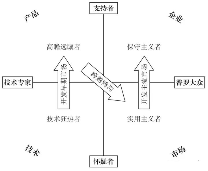 跨越鸿沟后的企业会被它在跨越鸿沟之前所做出的承诺缚住手脚。这些承诺是企业为了在早期市场站稳脚跟而匆忙做出的,在跨越鸿沟之后的新形势下根本无法履行。也就是说,企业在跨越鸿沟之前所承诺的业绩指标或报酬水平,如果真的全部兑现,那结果只有一个:毁掉企业。高科技企业要摆脱鸿沟,恰恰就应该做到“停止做自己”——必须认识到自己正在经历一个阶段,而且还要主动出击,有所作为。例如企业组织的变化,就需要从从开拓者文化到定居者文化。所谓开拓者文化,就是群体是一群突破技术应用边界的人。他们不因循守旧,也不喜欢建利基础设施的工作。他们的聪明才智推动了早期市场的发展。而定居者文化,则与之相反。定居者在公司站稳脚跟,对于主流市场来说是一个好兆头,因为主流市场的实用主义客户非常厌恶惊喜,他们喜欢安分可靠、四平八稳的定居者,不喜欢天马行空的开拓者。此外,研发决策也需要从产品到整体产品转变。整体产品应该如何研发,不是由实验室决定的,市场才是整体产品研发的主导力量。所以,整体产品研发应该从创造性的市场细分开始,而不是创新性的技术。