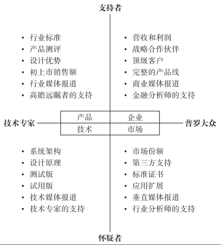 如何知道自己目前处于哪个阶段,则需要看产品进入到不同技术采用生命周期的证据。如下图所示,按顺时针方向走,从左下象限到左上象限,再从右上象限到右下象限,分别是技术狂热者、高瞻远瞩者、保守主义者、实用主义者想看到的证据。要特别注意的是,从产品到市场的过渡,对应的是跨越鸿沟的过程。这也印证了我们一直以来坚持的一个观点:实用主义者更关心市场对产品的反应,而不是产品本身。