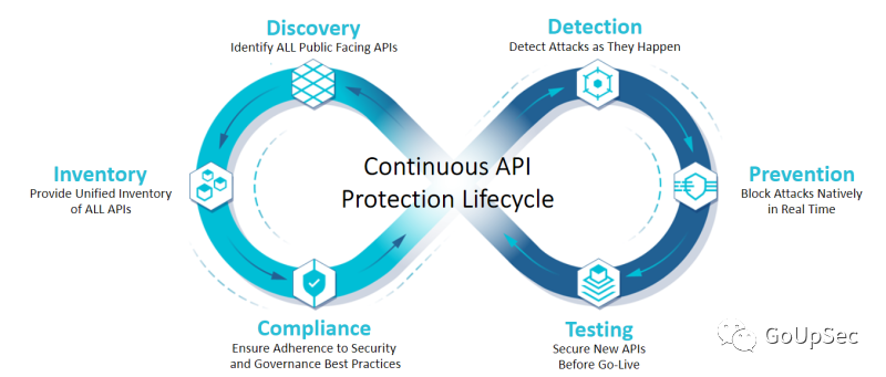 Cequence Security则将API防护划分为六个阶段,第一阶段从发现和识别所有面向公众的API开始,然后进阶到库存、合规性、检测、预防和检测(下图):