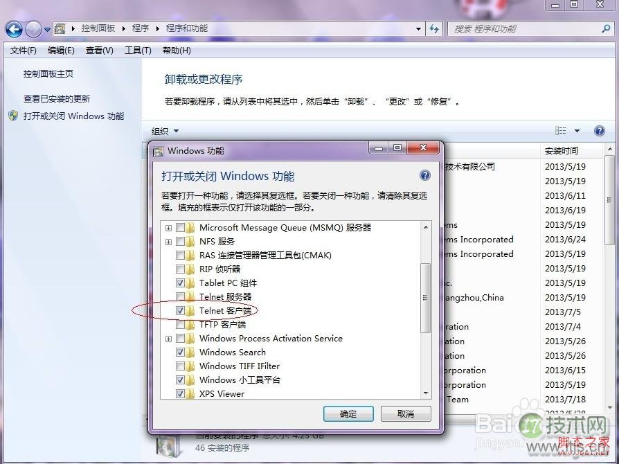 控制面板——程序——打开和关闭windows功能——勾选telnet客户端。接到简单