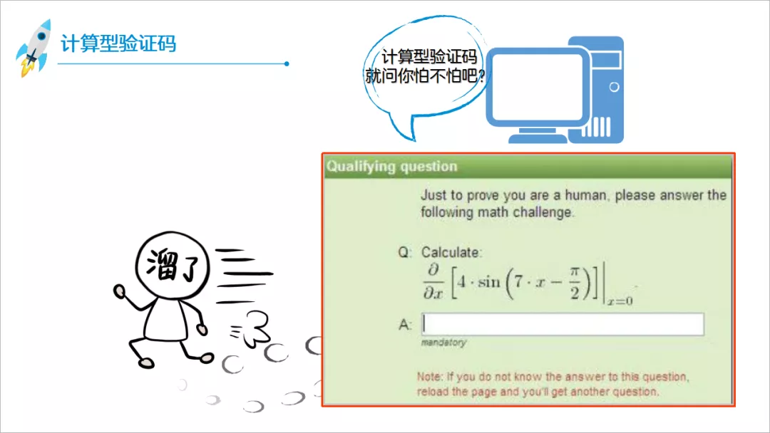 很遗憾,这种可以提供较高安全性的验证码,虽然计算机很难识别,但是大部分人类自己也觉得很难。所以计算型验证码,并没有广泛应用过。