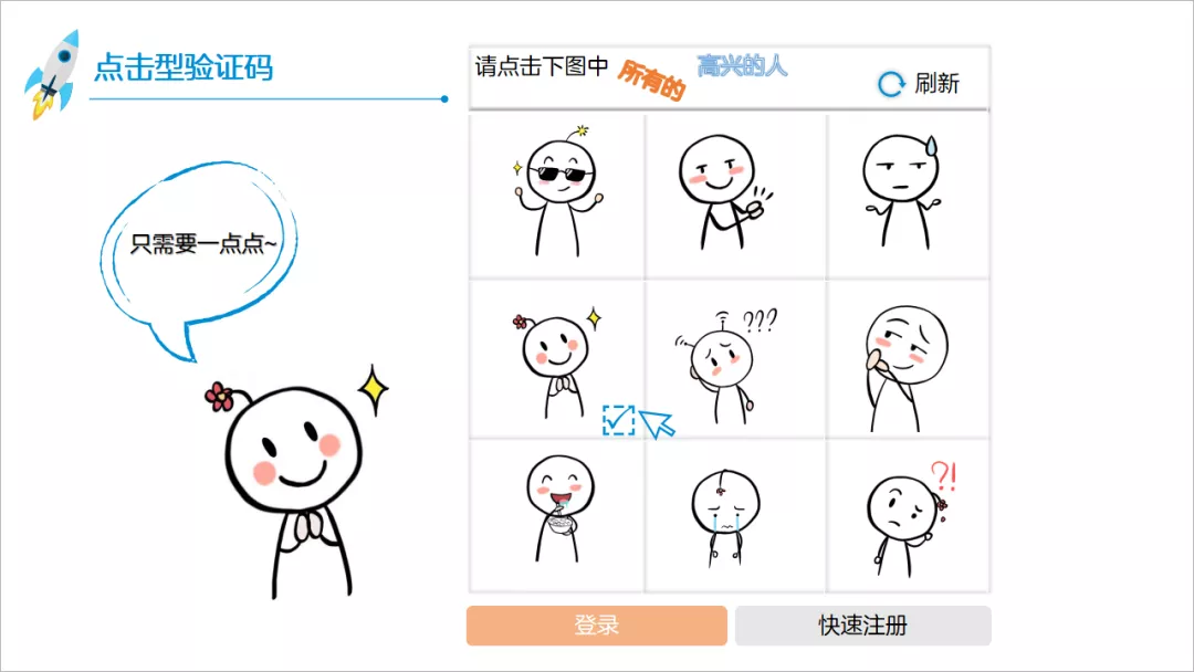 (3) 点击型点击型验证码的最大特点是:使用者只需要通过鼠标进行点击,不需要输入任何东西。通过这种人类专属的行为动作,以及使用者在浏览器中的一些操作数据、浏览数据等,共同识别出真正的人类。