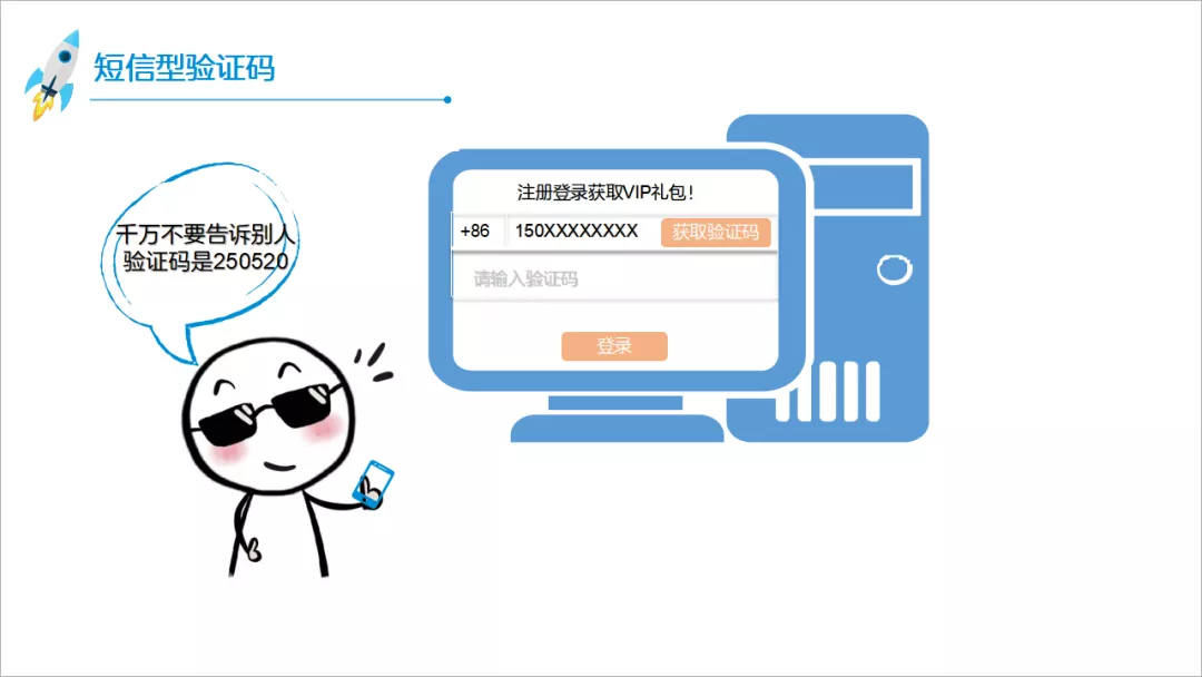 (5) 短信型短信型验证码,是最常用的一种方式。各种APP一般会采用这种方式,简单直接,通过运营商来发送短信,安全上有保障。
