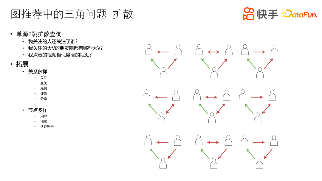 对于其他拓展场景,关系可以是多样化的,比如关注、互关、点赞、评论、分享,还有一些其它的关系比如 Facebook 好友等等。另一方面,节点也可以是多样的,包括用户、视频以及认证账号。