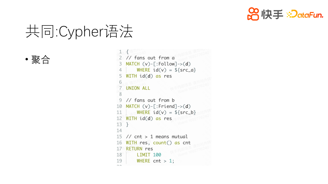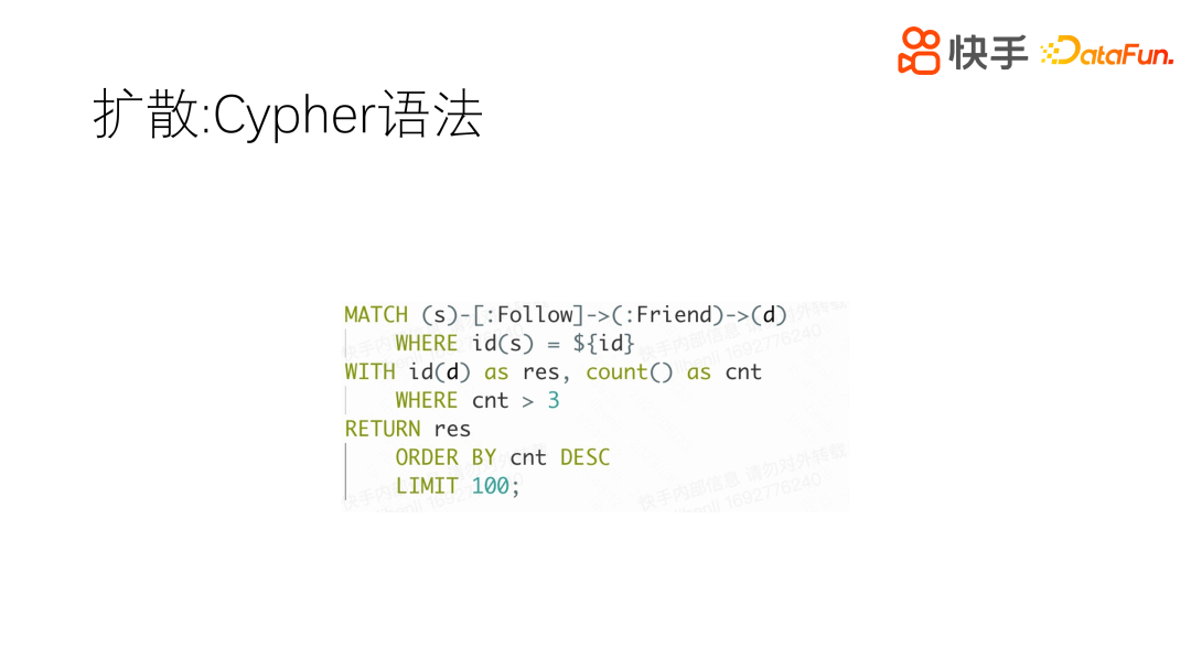 这种推荐方式可以用 Cypher 语法来描述,如上图所示,从一个点出发,经过一个边,再经过一个边,最终拿到一个点,对这个点来计数。当然这个计数只是云服务器一种方式,还有其它一些方法比如 sum(sim_score),计算出最终的 score 值,根据 score 值排序、截断,然后推荐。正常情况下,推荐的结果一般不会超过一千,但是中间访问到d的数据量是很大的,突破几十万都是很正常的。快手这边 Follow 上线目前是五千,其它边可以轻松达到几十万、上百万的数据量。