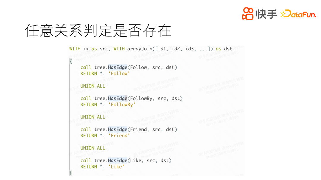 对于这类需求,我们采用了内置的图算法,看是否存在一个这样的边,如果存在一个这样的边,就返回一个 ‘Follow’、‘FollowBy’、‘Friend’、‘Like’ 等关系,这些关系是根据用户的使用场景具体定义的,最终对边进行标签化的展示。