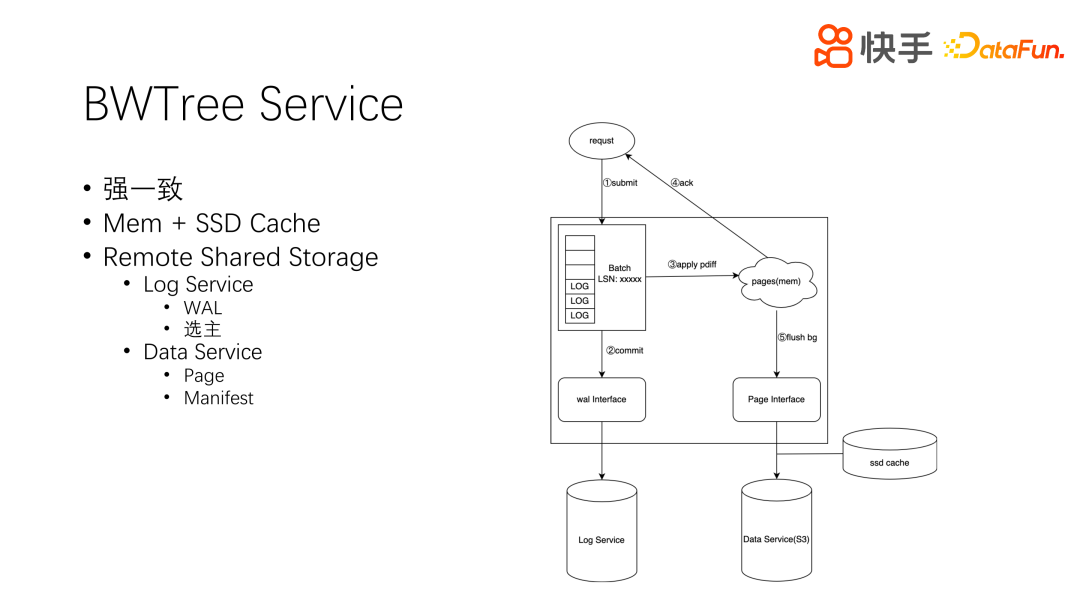 BWTree Service 是内存层,是图描述的一层,对其最主要的诉求就是强一致。因为图的模型有一些其他衍生出来的数据结构,比如唯一性索引,物化出来的 num neighbors、双关等,如果不能做到强一致,整个模型会存在一些问题。它主要是利用 Mem 和 SSD 作为 Cache。