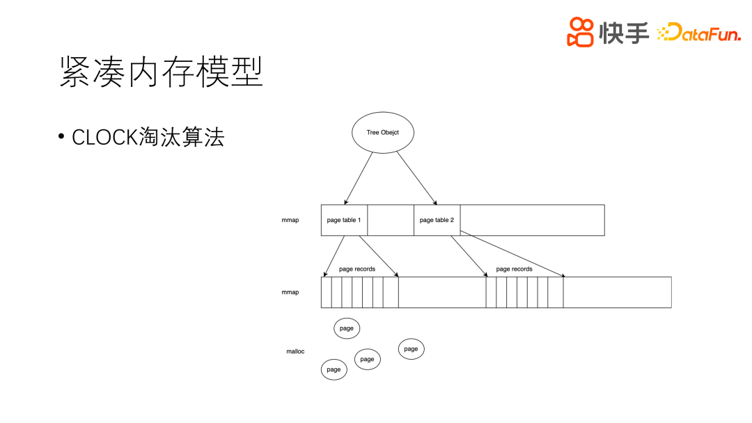 前文中提到,内存是成本的主要来源。我们的内存模型和操作系统是比较相似的。用 mmap 申请很大的三块内存,分别作为一/二/三级页表,和操作系统的页表是同一个概念,在紧凑的内存空间是没有任何浪费的。第三级页表,指向真实的数据。数据是用 malloc,因为我们希望页本身是可变大小的。实例内存比较满,就进行淘汰,从 page records 左侧开始遍历,遇到 access_num 为 0 的页就可以淘汰,这个过程也和操作系统比较像,因此我们也是用的 CLOCK 淘汰算法。