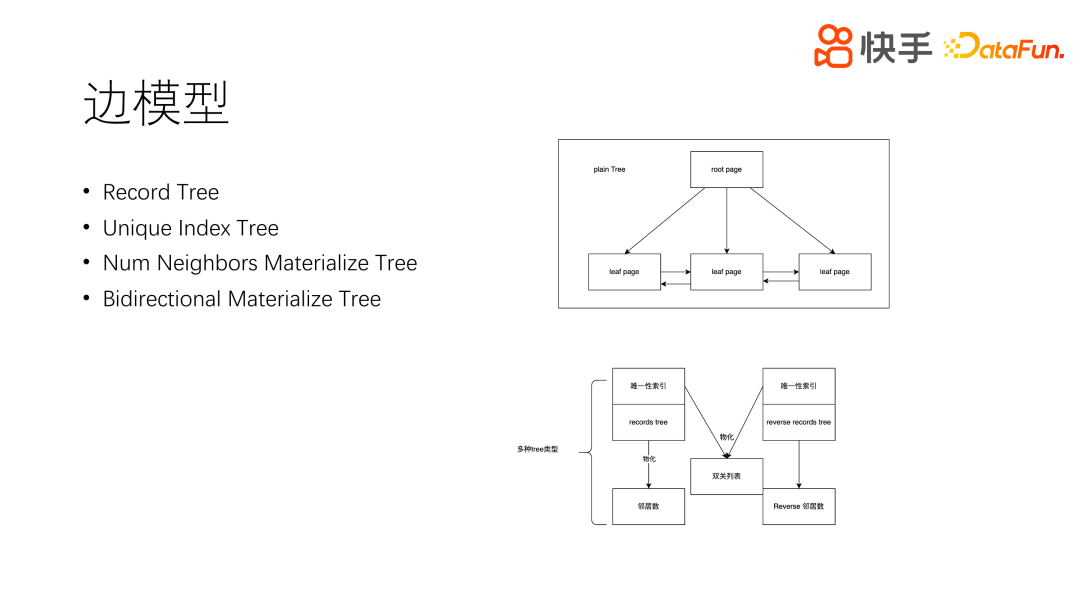 前面讲解了树模型,但是树模型不能完整地描述边,边有四种树结构,分别是 Record Tree、Unique Index Tree、Num Neighbors Materialize Tree 和 Bidirectional Materialize Tree。Record Tree 是记录树,Unique Index Tree 是索引树,关系链树是需要维护索引的。Num Neighbors Materialize Tree 是邻居的物化视图,主要记录在一点有多少个邻居,有多少个评论树,多少个好友树。物化视图的更新主要是依据普通的树更新,根据主树来更新。Bidirectional Materialize Tree 是双关物化视图,根据出边和入边物化出一个双关列表。以上四种树可以根据用户配置来进行生成或不生成。