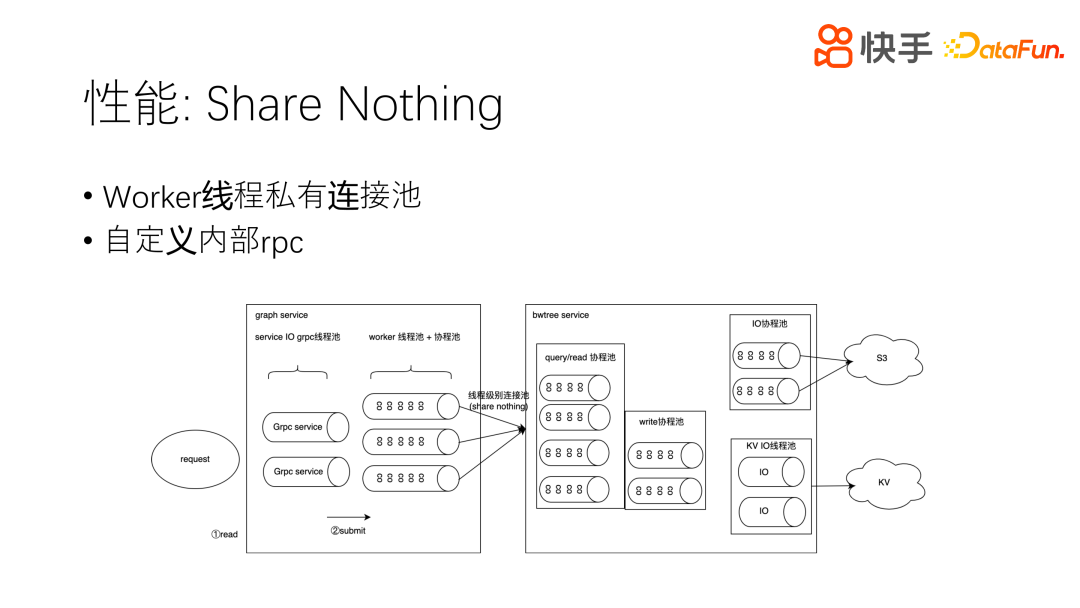 比较重要的做 Share Nothing,这是数据库中一个比较经典的概念。用户的一个请求到了一个线程,这个线程有个协程,协程在发起请求的情况下使用线程绑定的连接池发起,不用再跨线程。因为跨线程是很耗时的,即使什么也不做也要时延大概 0.08 毫秒,如果多次跨线程总时延会达到 0.4 毫秒,对于线上的一些核心产品应用来说,和 Redis 对比,0.4 毫秒已经是比较高的延时了。Share Nothing 要求连接和本线程进行绑定,和 Tree Service 特定 worker 线程绑定,同样,在收到请求的情况下,也是在本线程执行,主要是读的过程,如果要发起到 S3 冷存储查询请求,或 KV 磁盘存储查询请求也都是在本线程。这就是 Share Nothing 的概念,尽量不要跨线程,数据也是在本线程完成的。