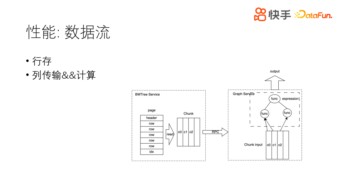 以上介绍了数据请求的过程,接下来看一下数据回传的过程。数据最终的叶子节点,存储格式是行存,但是在读之后就成为了列存格式。因为行存在更新时性能会比较好,列存时实时更新性能极差。因此,我们做了取舍,存储时用行存,读出之后所有数据用列存。读出之后的列存数据格式,在经过 RPC 时,压缩效率和传输效率等都会比较高。最终到 Graph 层,数据经过一个个算子表达式。列存数据作为算子的输入,可以做向量化的运算。最终拿到的输出也是列式进行输出,我们用的是 Apache-Arrow 数据存储格式返回给用户,也是列式存储。因此,这样的架构特别适合图地查询和计算。