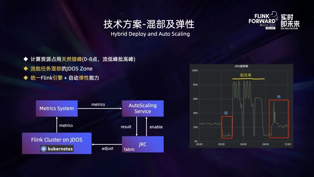上图右侧图表是我们在 JDOS Zone 中进行流批混部并结合弹性伸缩服务试点测试时的 CPU 使用情况。可以看到 0 点流任务进行了缩容,将资源释放给批任务。我们设置的新任务在 2 点开始执行,所以从 2 点开始直到早上批任务结束这段时间,CPU 的使用率都比较高,最高到 80% 以上。批任务运行结束后,在线流量开始增长时,流任务进行了扩容,CPU 的使用率也随之上升。