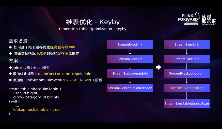 在实现层面我们新增了一条叫 StreamExecLookupHashJoinRule 的优化规则,并且把它添加到物理 rewrite 的阶段。在最底层的扫描数据 StreamExecTableSourceScan 和维表 join StreamExecLookupJoin 之间增加了一个 StreamExecChange 节点,由它来完成对维表数据的哈希操作。可以通过在定义维表 DDL 时指定 lookup.hash.enable=true 来开启这个功能。