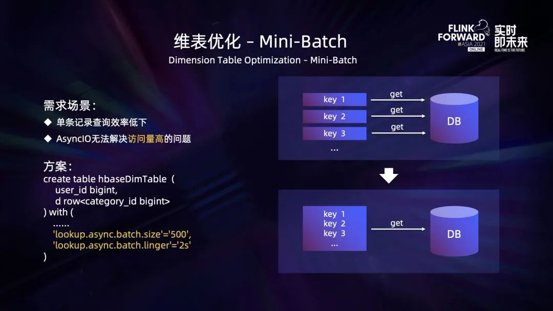 针对维表 join 单条查询效率比较低的问题,解决思路也很简单,就是攒批,按照微批的方式去访问 (mini-batch)。可以在 DDL 的定义中通过设置 lookup.async.batch.size 的值来指定批次的大小。除此之外,我们还在时间维度上引入了 Linger 机制来做限制,防止极端场景出现迟迟无法攒够一批数据而导致时延比较高的情况,可以通过在 DDL 的定义中设置 lookup.async.batch.linger 的值来指定等待时间。