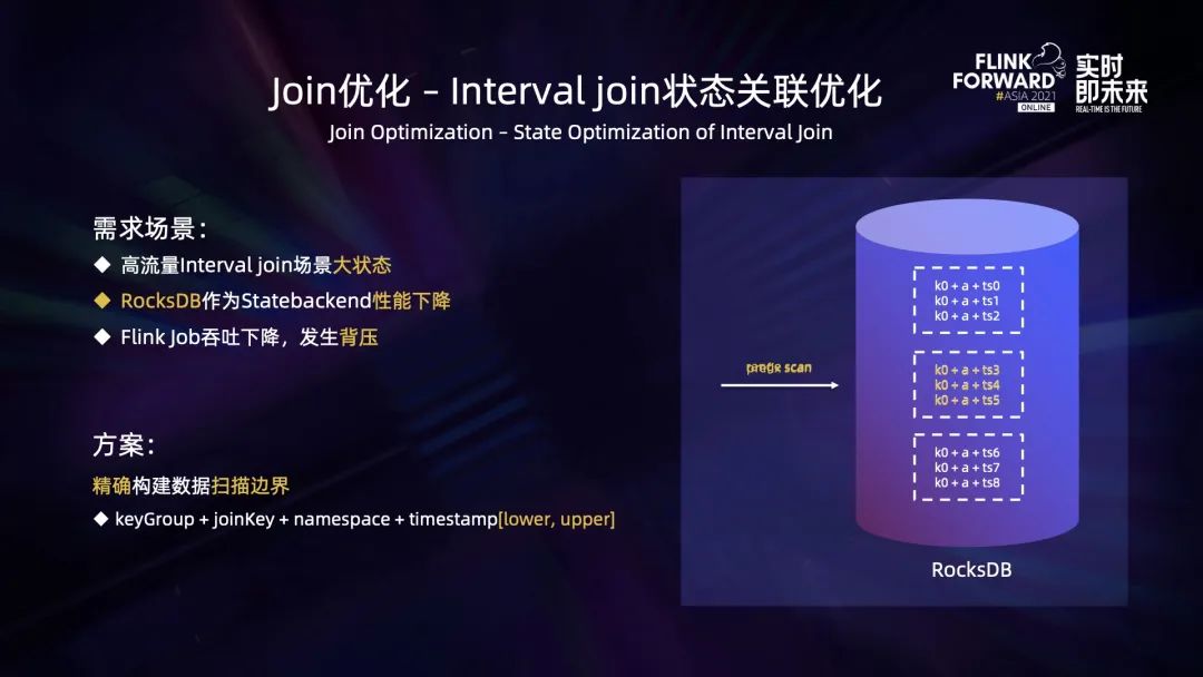 通过分析我们发现,根本原因与 Flink 底层扫描 RocksDB 是基于前缀的扫描方式有关。因此解决思路也很简单,根据查询条件,精确地构建查询的上下界,把前缀查询变为范围查询。查询条件依赖的具体上下界的 key 变为了 keyGroup+joinKey+namespace+timestamp[lower,upper],可以精确地只查询某些 timestamp 之间的数据,任务的背压问题也得到了解决。而且数据量越大,这种优化带来的性能提升越明显。