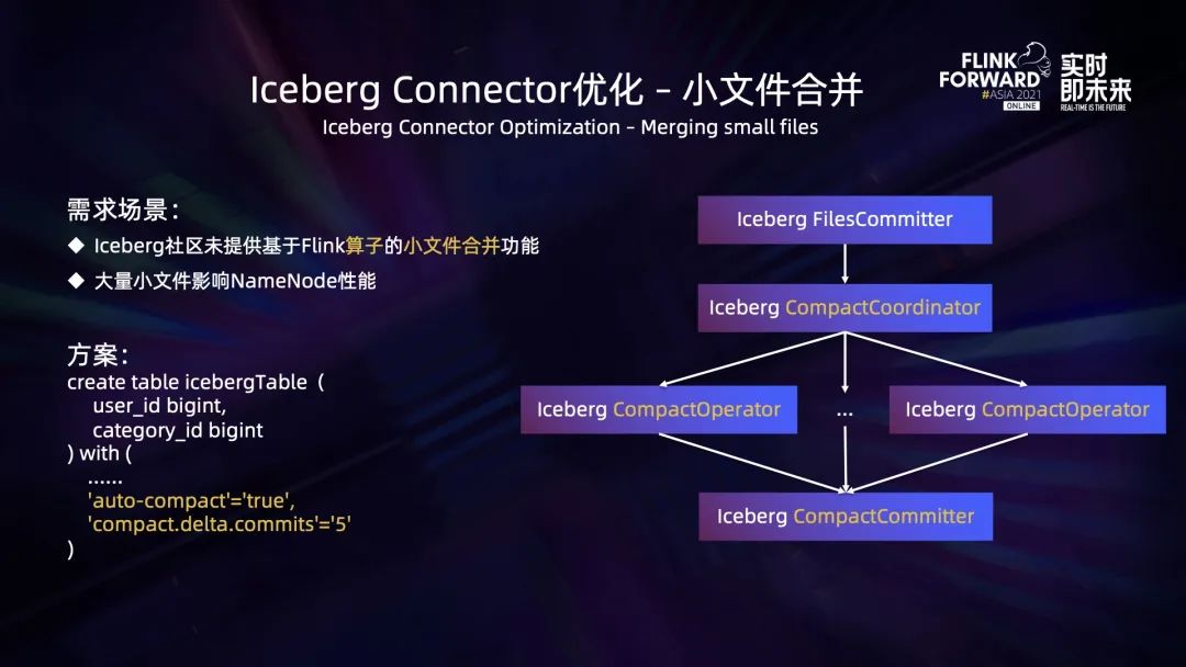 对于端到端实时性要求不高的应用,可以选择 Iceberg 作为下游的统一存储。但是鉴于计算本身的特性、用户 checkpoint 间隔的配置等原因,可能导致产生大量的小文件。Iceberg 的底层我们选用 HDFS 作为存储,大量的小文件会对 Namenode 产生较大的压力,所以就有了合并小文件的需求。