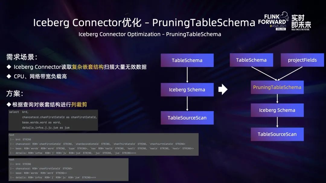 解决这个问题,要满足两个条件,第一个条件是读取 Iceberg 的数据结构 schema 只包含用户需要的字段,第二个条件是 Iceberg 支持按列名去读取数据,而这个本身已经满足了,所以我们只需要实现第一个条件即可。