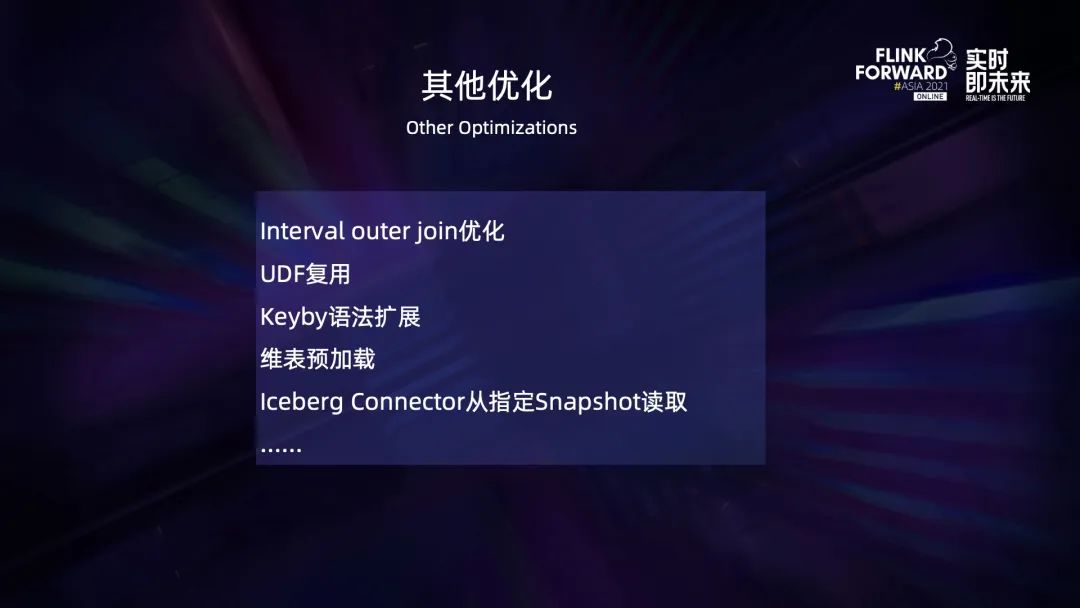 此外,我们还实现了一些其他优化,比如修复了 interval outer join 数据晚于 watermark 下发、且下游有时间算子时会导致的数据丢失问题,UDF 的复用问题,FlinkSQL 扩展 KeyBy 语法,维表数据预加载以及 Iceberg connector 从指定的 snapshot 去读取等功能。