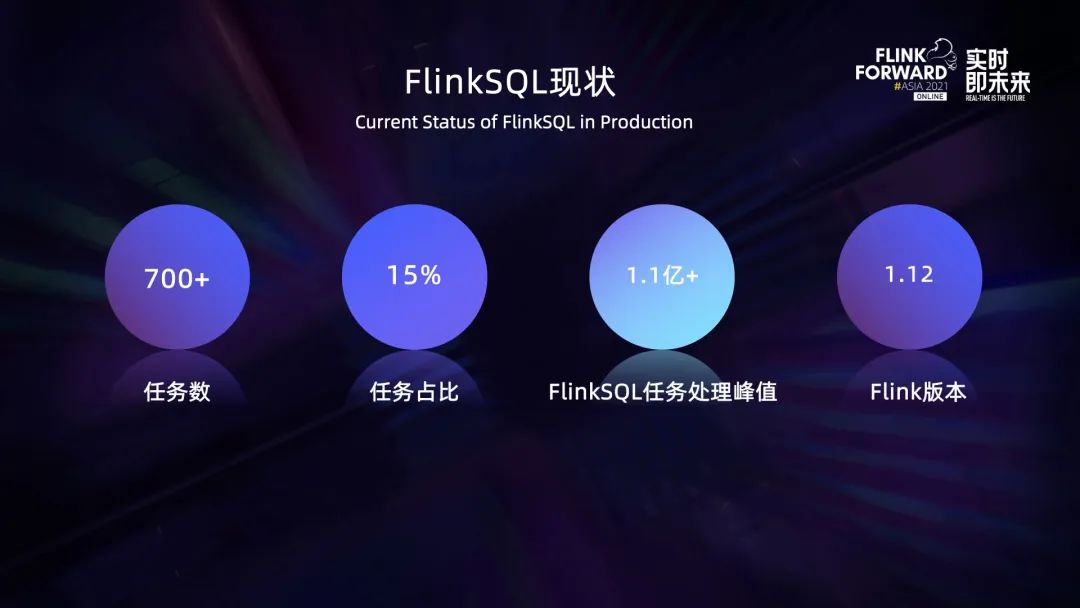 京东目前 FlinkSQL 线上任务 700+,占Flink总任务数的 15% 左右,FlinkSQL 任务累计峰值处理能力超过 1.1 亿条/秒。目前主要基于社区的 1.12 版本进行了一些定制优化。