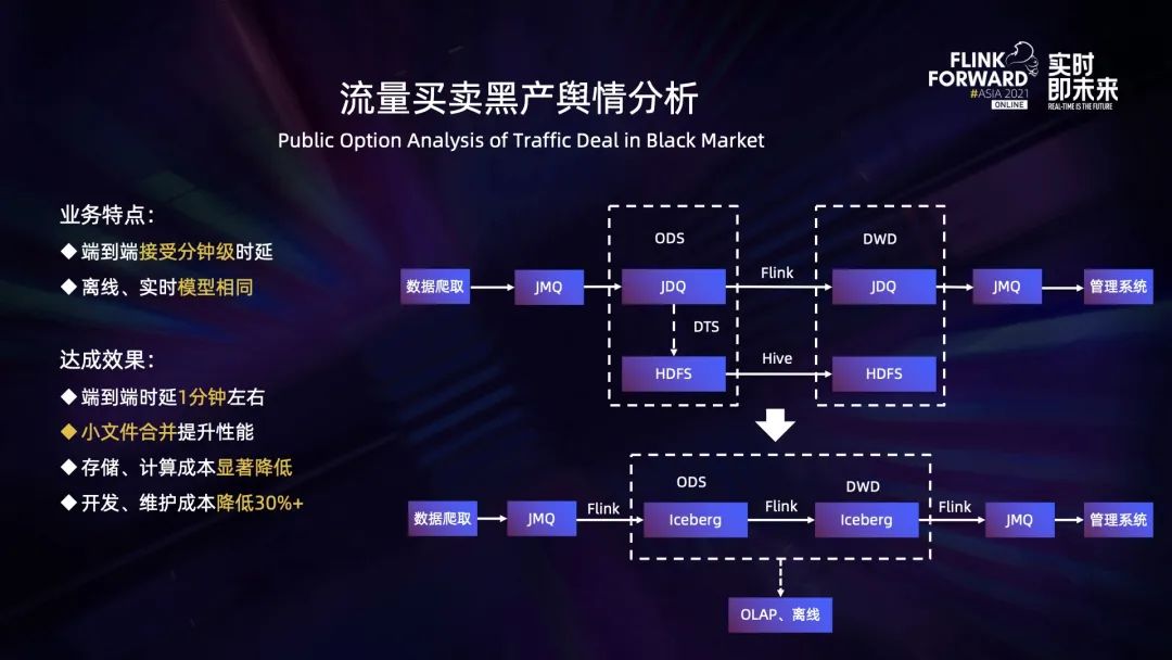 流量买卖黑产的舆情分析。它的主要流程如下:源端通过爬虫获取相关信息并写入到 JMQ,数据同步到 JDQ 以后,通过 Flink 处理然后继续写下游的 JDQ。与此同时,通过 DTS 数据传输服务,将上游 JDQ 的数据同步到 HDFS,然后通过 Hive 表进行离线的数据加工。